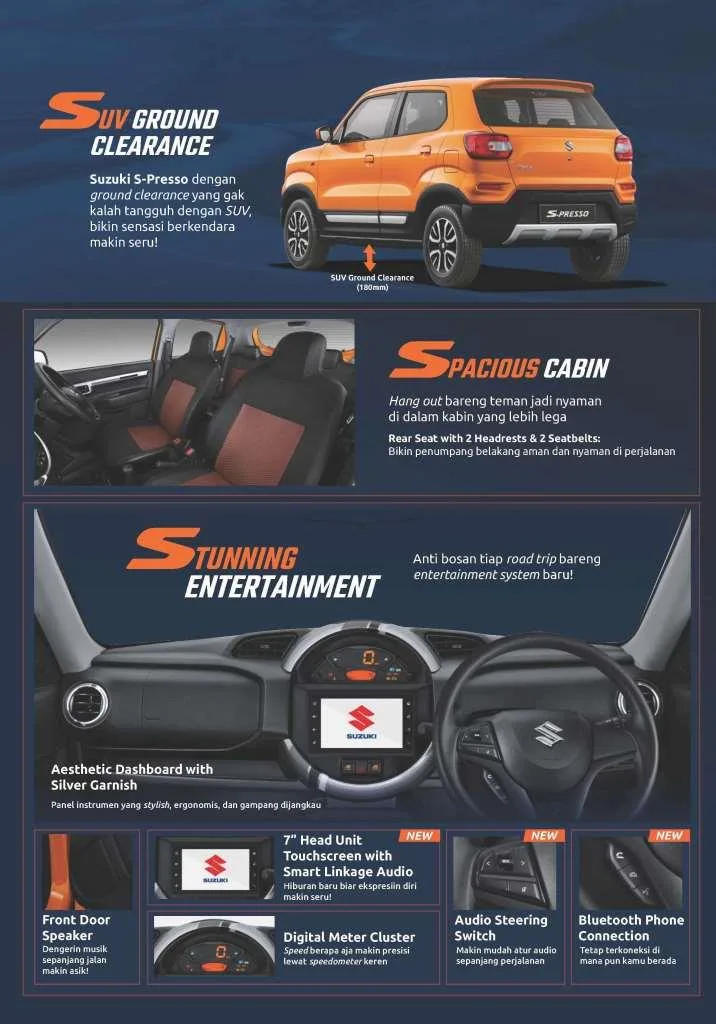 Sebagai sebuah city car, S-Presso memiliki desain yang kompak dan gaya serta menawarkan berbagai keunggulan yang membuat mobil ini value for money.