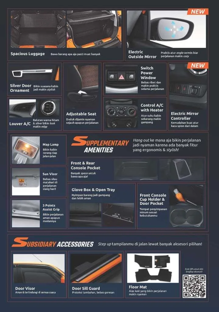 S-Presso memiliki tampilan eksterior yang kekinian, gaya, dan sporty serta dilengkapi dengan Headlamp with Turning Signal, Chrome Front Grille, Lower Radiator Cover, Front Skid Plate, Rear Spoiler & High Mount Stop Lamp, Rear Defogger, Rear Skid Plate, Rear Combination Lamp, Body Color Door Handle and Outside Mirror, Side & Wheel Arch Cladding, Dual Tone Alloy Wheel 14”